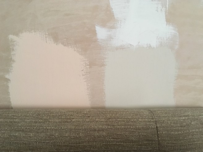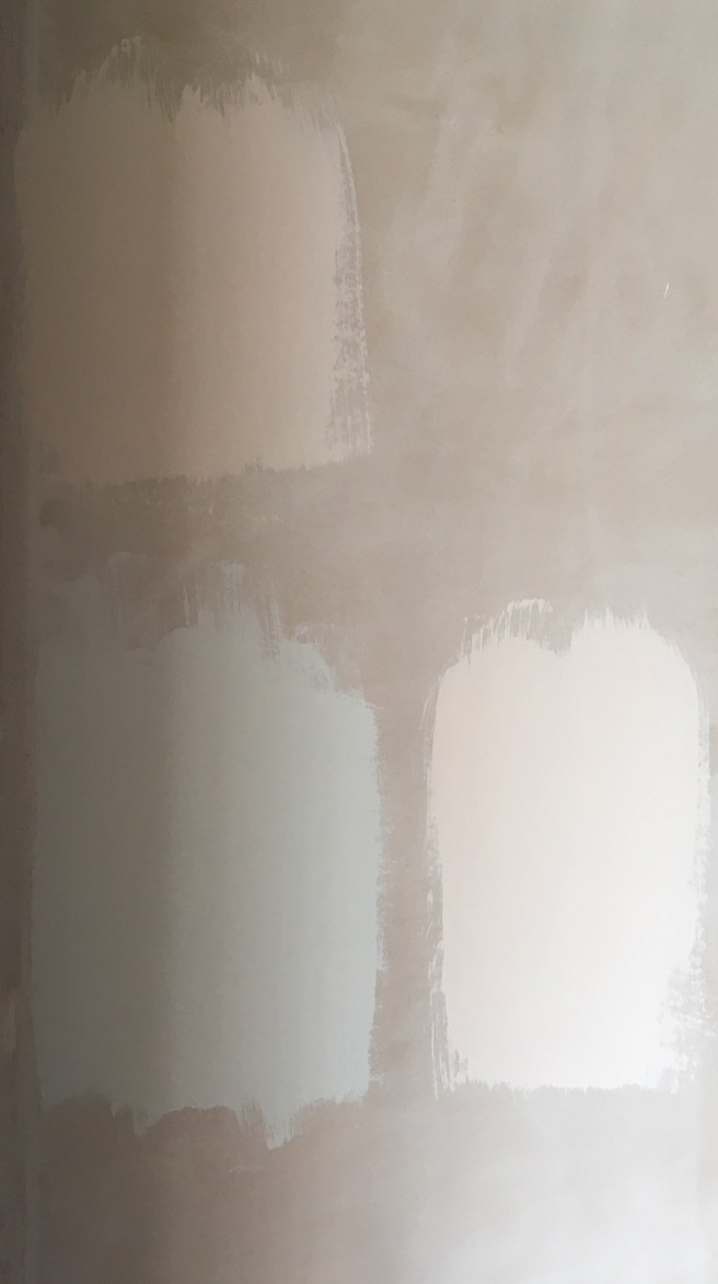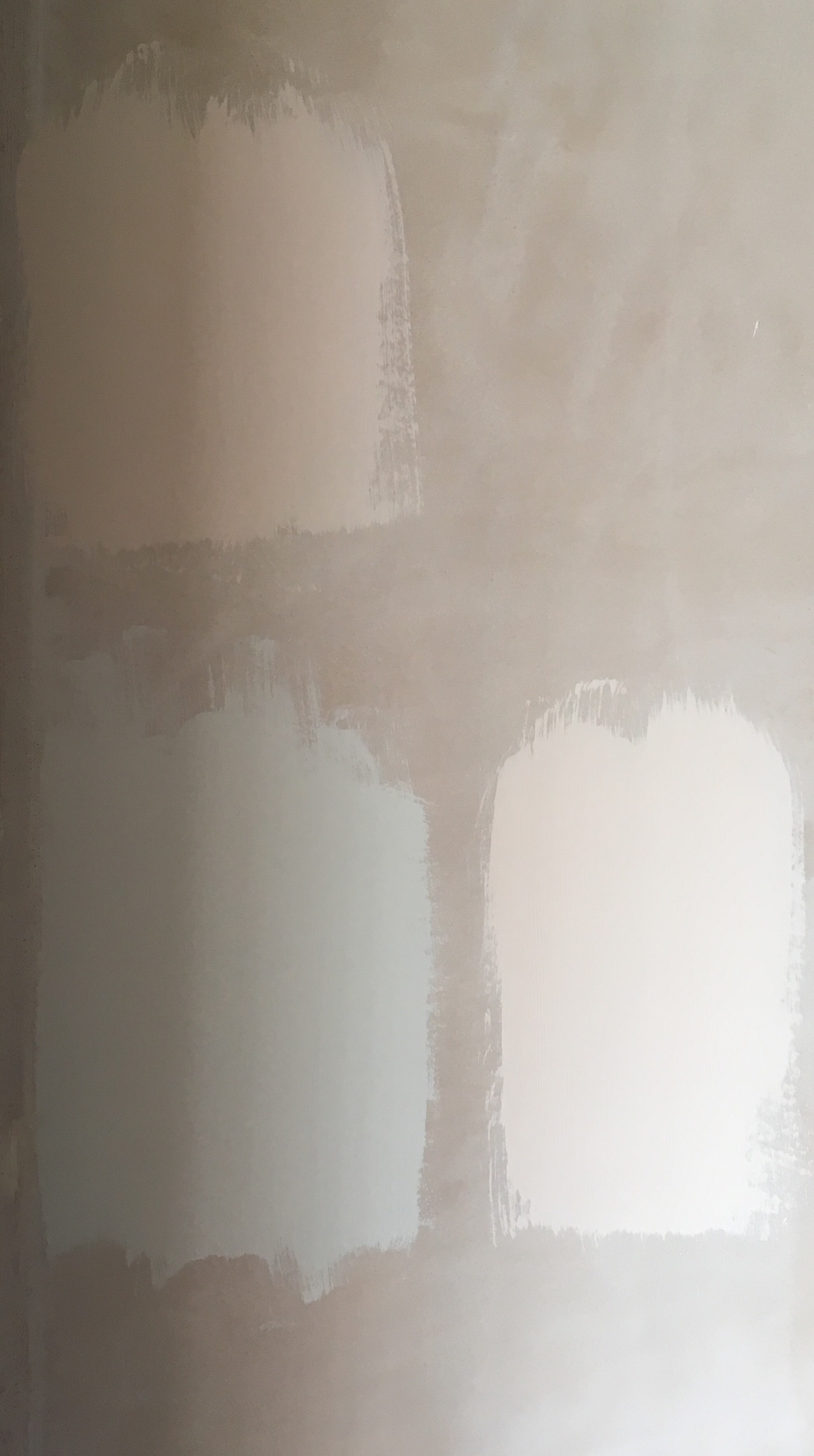And I’ve included this one because I think it represents how the colour changes so dramatically in the room. Top left is Pink Ground, bottom left is Rabbit’s Foot and then the bottom right is another patch of Pink Ground. So, focusing on Pink Ground – in the shadowy areas it’s looking kind of beige, in the average light areas it looks a little peachy for my tastes and then in the areas with bright light it’s…well, kind of, perfect actually. I’d pick it immediately if the colour consistently looked like that across the room.