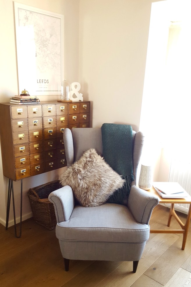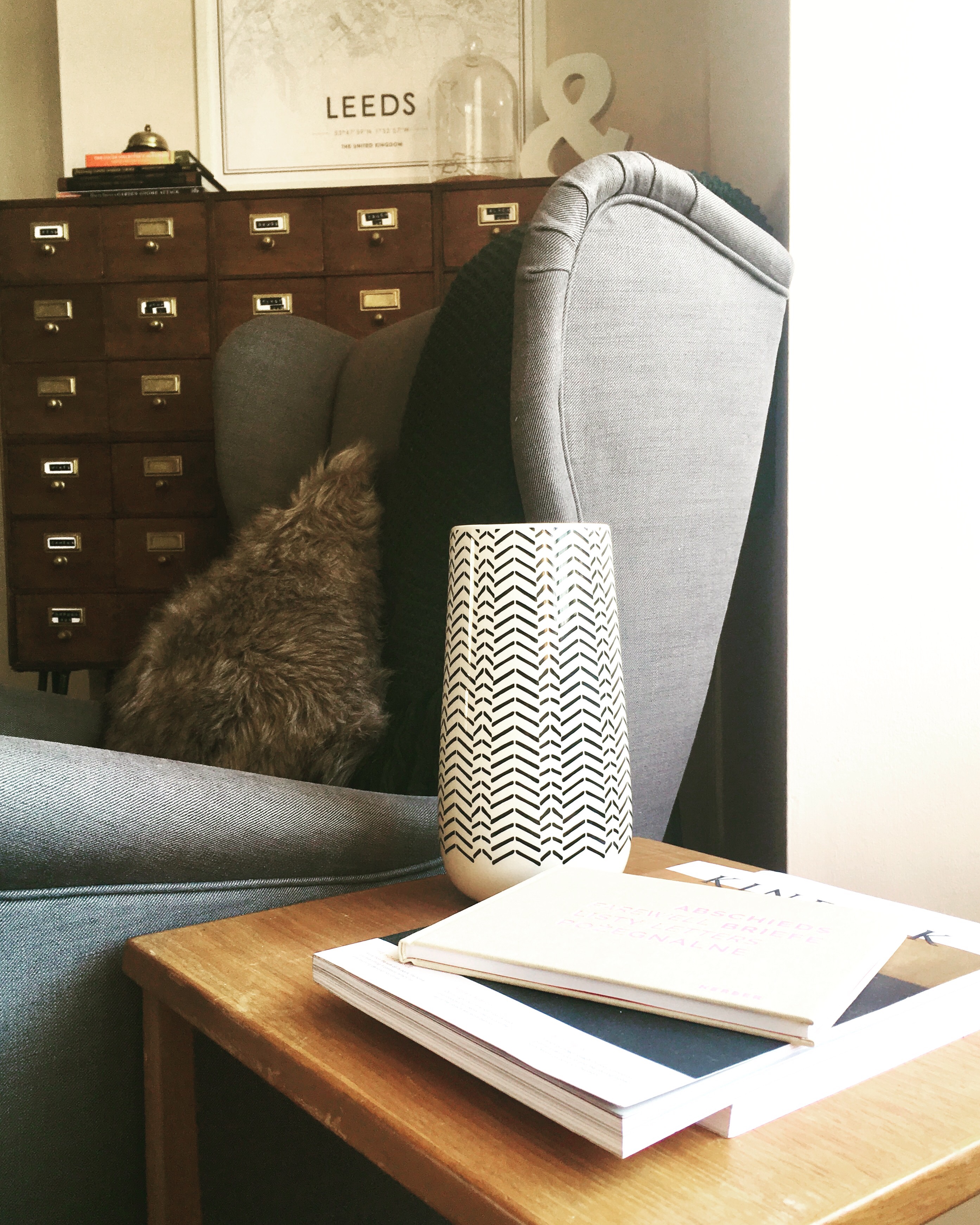 I toyed with kind of quitting and not posting this “reveal” after a mini disaster last night meant I couldn’t get the coffee table I’ve DIY’d finished, because the room really does look weirdly bare without it but I’ve sucked it up and this is where I am this morning. Literally. I ran around trying to quickly take some pictures in my pyjamas this morning!