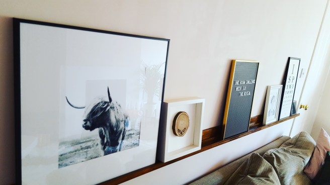 On picture ledge from left to right › Highland Cow print from Desenio, Letterboard from Oliver Bonas, Hot Rod watercolour quote print from The Spanish Lady, I Spy Eyechart from The Calm Gallery, Shark’s Teeth from Hannah Brown Interiors